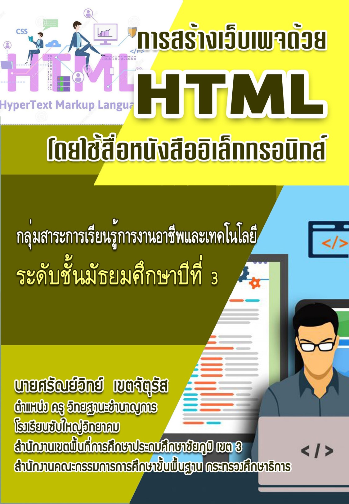 การพัฒนาหนังสืออิเล็กทรอนิกส์ (e-book) วิชาคอมพิวเตอร์ เรื่องการสร้างเว็บเพจด้วย HTML กลุ่มสาระการเรียนรู้การงานอาชีพและเทคโนโลยี ชั้นมัธยมศึกษาปีที่ 3 |